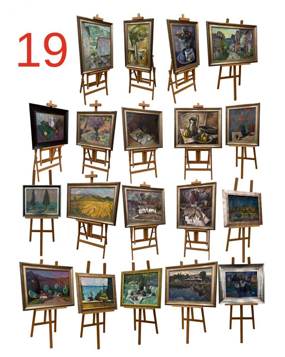 Пропонується цілісна авторська колекція з 19 живописних робіт, оформлених у якісні дерев’яні італійські рами. Колекція ретельно підібрана та демонструє зрілий період творчості митця: натюрморти, пейзажі, жанрові композиції.