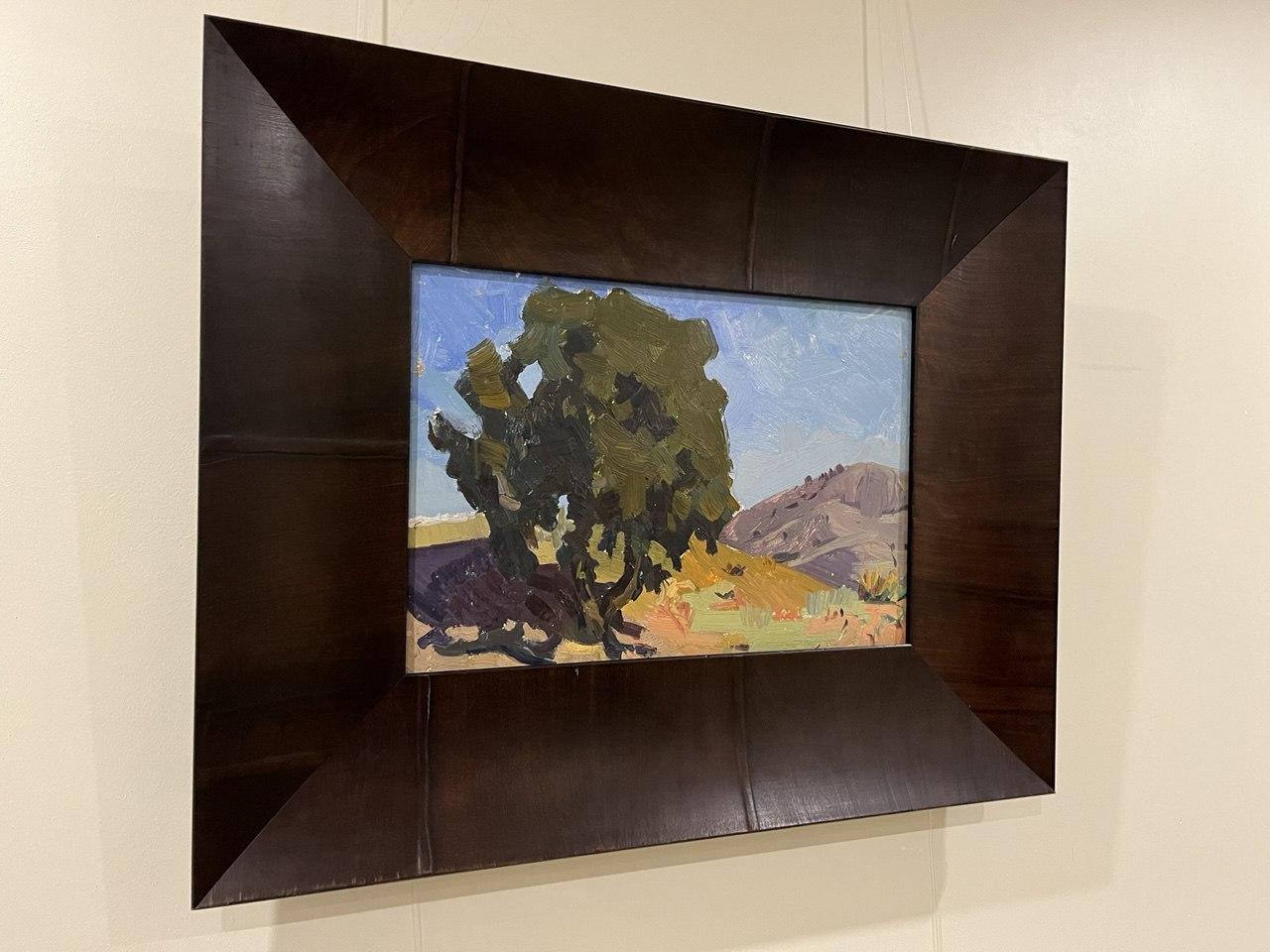 Этюд передает южный крымский пейзаж с обобщенными формами деревьев и холмов. Широкий, уверенный мазок, насыщенная зелено-охристая палитра и открытое небо создают ощущение простора, солнца и тишины. Работа демонстрирует мастерство художника в передаче света и воздуха пленэру.