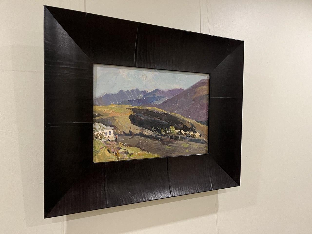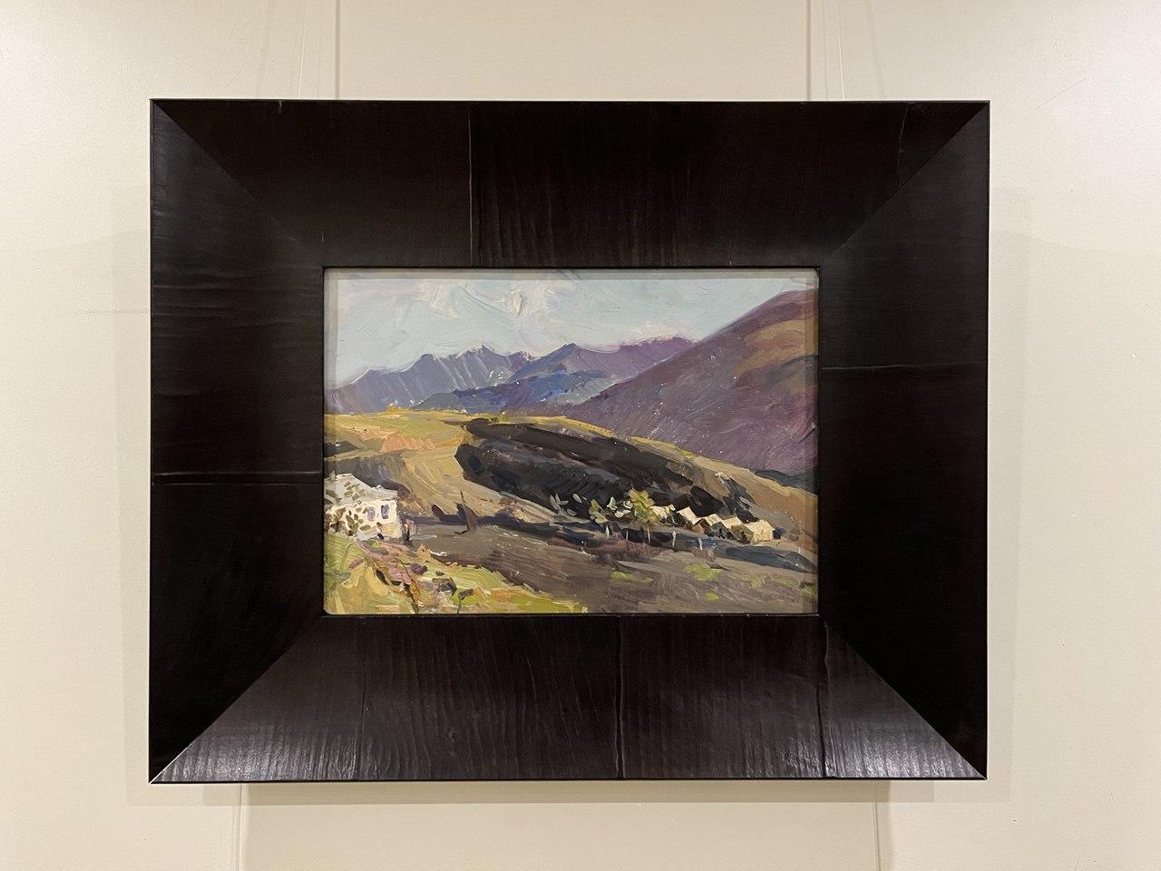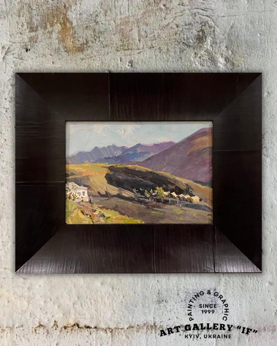 Більш розгорнута композиція з гірським рельєфом і невеликими будинками, що губляться в долині. Контраст теплих охристих тонів землі та холодних фіолетово-синіх гір надає роботі глибини й драматургії. Етюд виглядає завершеним і самодостатнім, попри камерний формат.